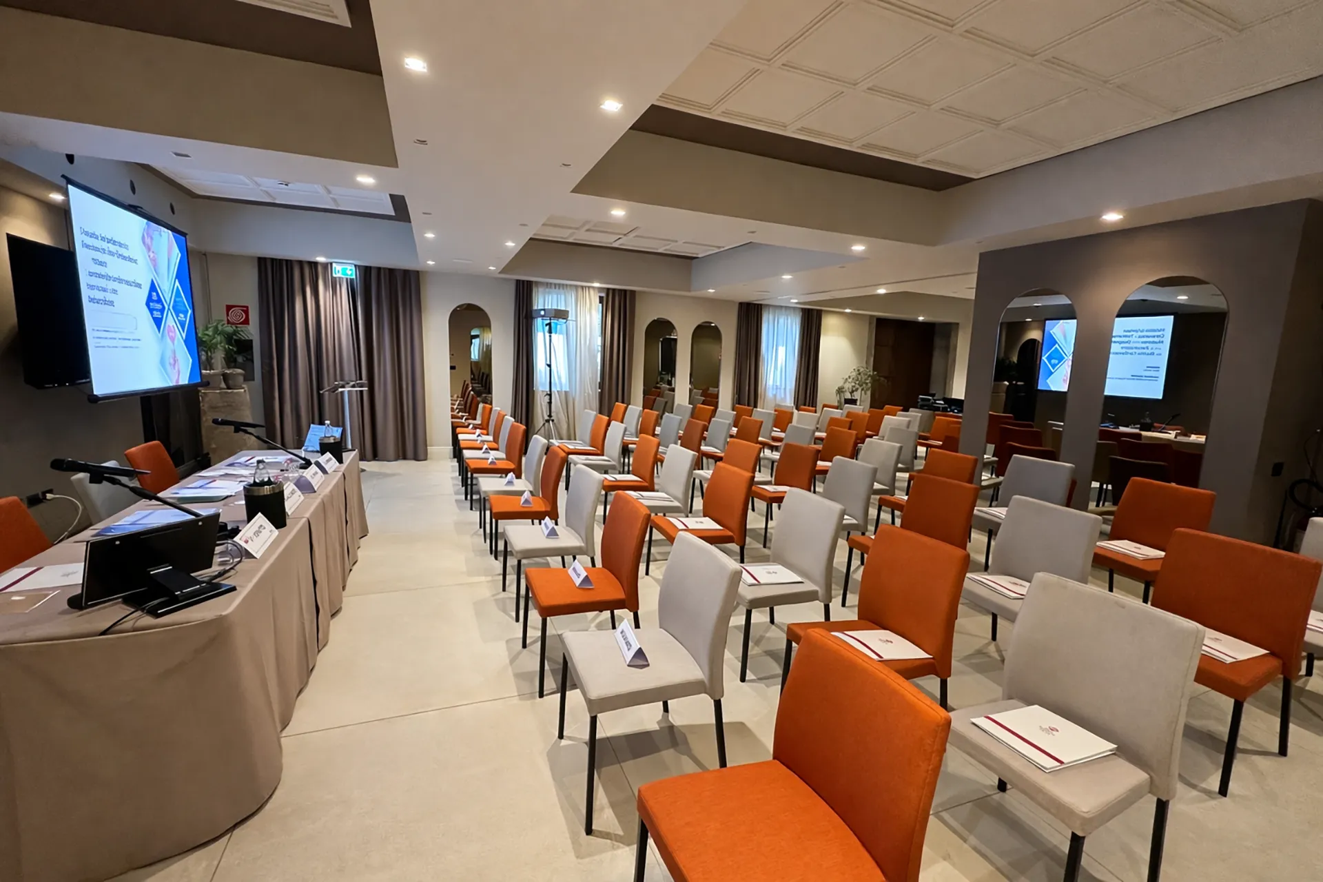 La sala può essere divisa in due distinti ambienti, le sale Levante e Ponente, attrezzate con le più moderne tecnologie per offrire la massima funzionalità alla clientela business dell’hotel che desidera una location pratica e suggestiva per il proprio evento aziendale.